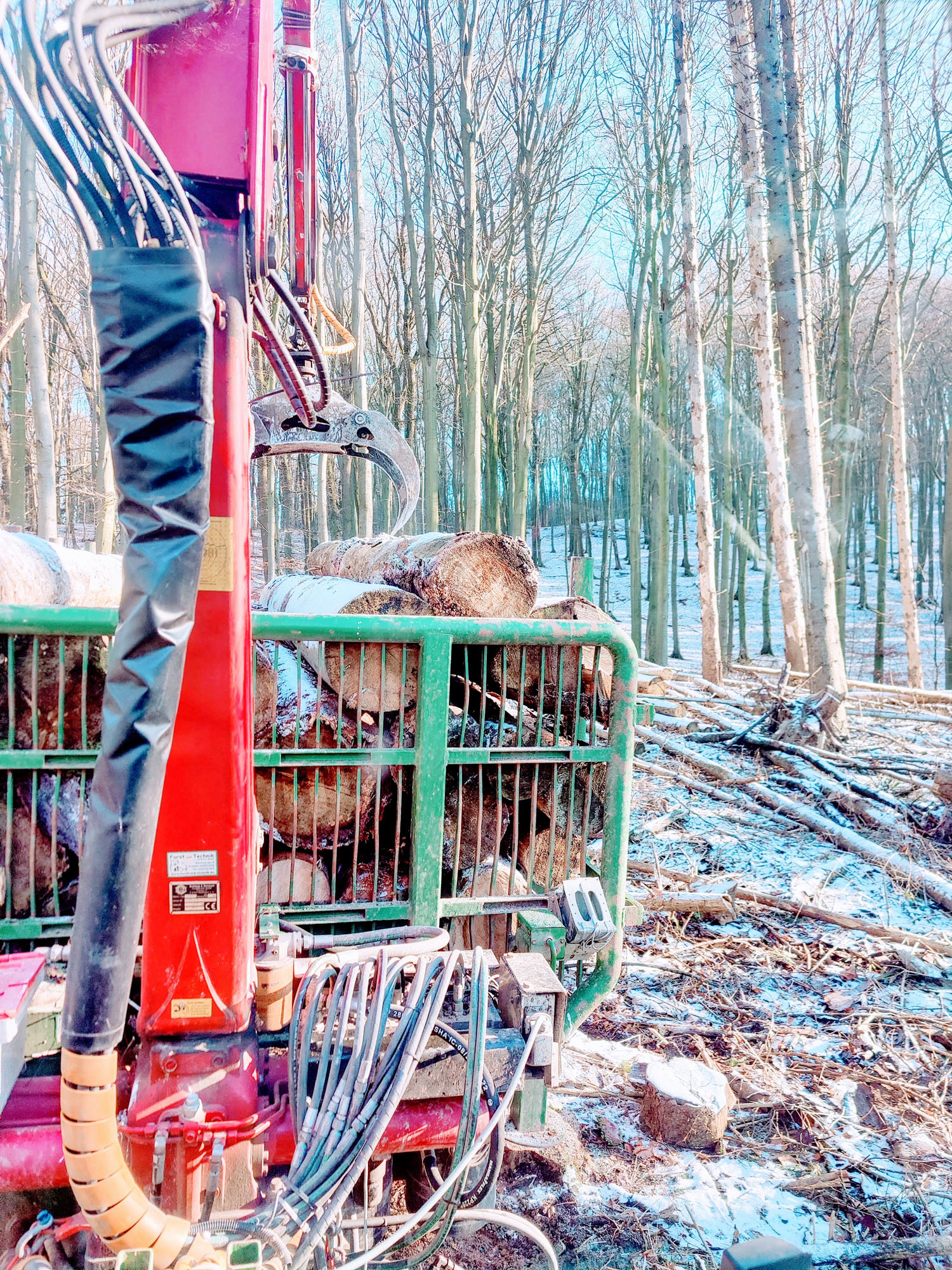 Geliefert wird das Holz mit einem Rückewagen und 8m Kran.
